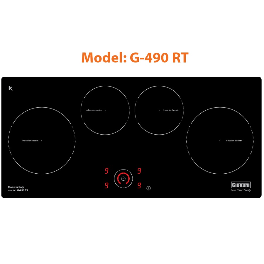 Bếp từ Giovani G-490RT nhập khẩu nguyên chiếc từ Ý  gồm 4 vùng nấu, sử dụng bảng điều khiển điều khiển cảm ứng trượt + xoay tròn hiện đại với 9 cấp độ công suất nhiệt độ khác nhau, điều khiển dễ dàng bằng một ngón tay, mọi chương trình nấu đều được hiển thị qua đèn Led sắc nét để bạn điều chỉnh cho phù hợp với các món ăn.